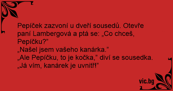 Pepíček zazvoní u dveří sousedů. Otevře paní Lambergová a ptá se: „Co chceš, Pepíčku?”