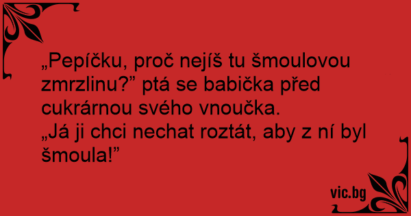 „Pepíčku, proč nejíš tu šmoulovou zmrzlinu?” ptá se babička před cukrárnou svého vnoučka.