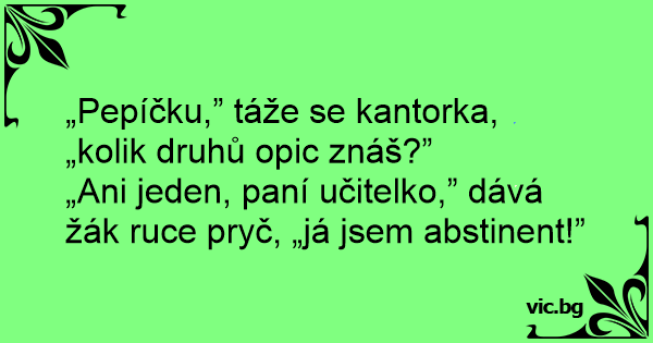 „Ani jeden, paní učitelko,” dává žák ruce pryč, „já jsem abstinent!”