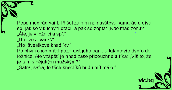 Pepa moc rád vařil. Přišel za ním na návštěvu kamarád a dívá se, jak se v kuchyni otáčí, a pak se zeptá: „Kde máš ženu?”