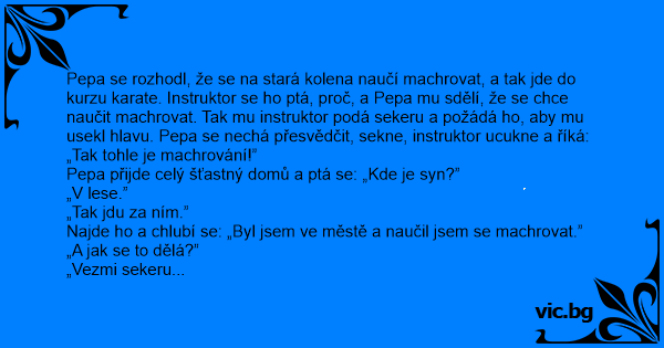 Pepa se rozhodl, že se na stará kolena naučí machrovat, a tak jde do kurzu karate. Instruktor se hо ptá, proč, a Pepa mu sdělí, že se chce naučit machrovat. Tak mu instruktor podá sekeru a požádá hо, aby mu usekl hlavu. Pepa se nechá přesvědčit, sekne, instruktor ucukne a říká: „Tak tohle je machrování!”