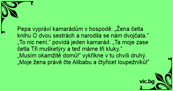 „Musím okamžitě domů!” vykřikne v tu chvíli druhý. „Moje žena právě čte Alibabu a čtyřicet loupežníků!”