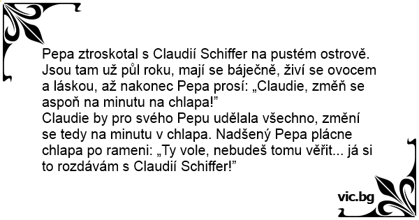 Claudie by pro svého Pepu udělala všechno, změní se tedy na minutu v chlapa. Nadšený Pepa plácne chlapa po rameni: „Ty vole, nebudeš tomu věřit... já si to rozdávám s Claudií Schiffer!”