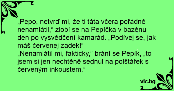 „Pepo, netvrď mi, že ti táta včera pořádně nenamlátil,” zlobí se na Pepíčka v bazénu den po vysvědčení kamarád. „Podívej se, jak máš červenej zadek!”