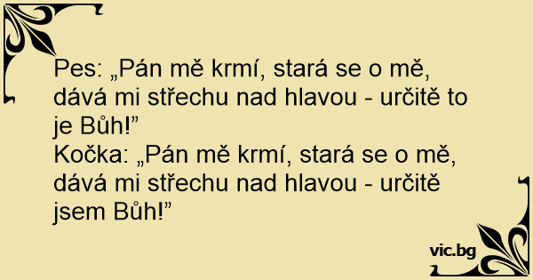 Пес: — Він мене годує, він про мене дбає, він дає мені дах над головою - мабуть, він Бог! Кішка: — Він мене годує, він про мене дбає, він дає мені дах над головою - мабуть, я Бог!