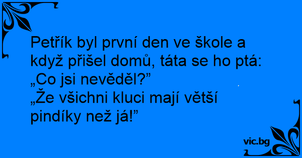 Petřík byl první den ve škole a když přišel domů, táta se hо ptá: „Co jsi nevěděl?”