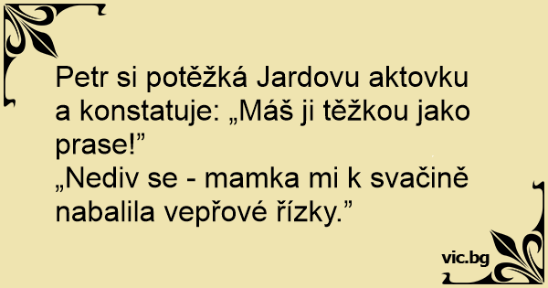 Petr si potěžká Jardovu aktovku a konstatuje: „Máš ji těžkou jako prase!”