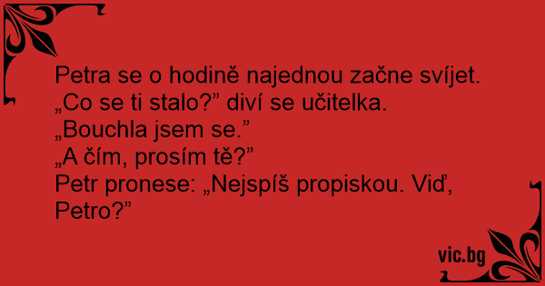 Petr pronese: „Nejspíš propiskou. Viď, Petro?”