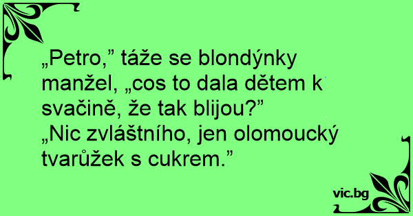 „Petro,” táže se blondýnky manžel, „cos to dala dětem k svačině, že tak blijou?”