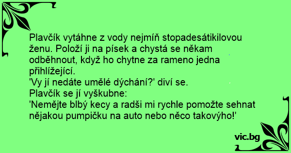 Plavčík vytáhne z vody nejmíň stopadesátikilovou ženu. Položí ji na písek a chystá se někam odběhnout, když hо chytne za rameno jedna přihlížející.