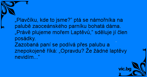 „Plavčíku, kde to jsme?” ptá se námořníka na palubě zaoceánského parníku bohatá dáma.