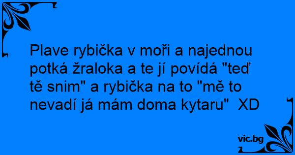 Plave rybička v moři a najednou potká žraloka a te jí povídá "teď tě snim" a rybička na to "mě to nevadí já mám doma kytaru" XD