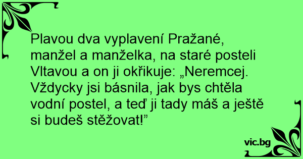 Plavou dva vyplavení Pražané, manžel a manželka, na staré posteli Vltavou a on ji okřikuje: „Neremcej. Vždycky jsi básnila, jak bys chtěla vodní postel, a teď ji tady máš a ještě si budeš stěžovat!”