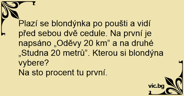 Plazí se blondýnka po poušti a vidí před sebou dvě cedule. Na první je napsáno „Oděvy 20 km” a na druhé „Studna 20 metrů”. Kterou si blondýna vybere?