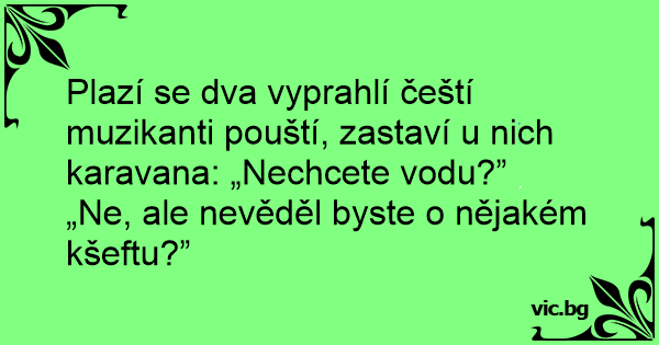 Plazí se dva vyprahlí čeští muzikanti pouští, zastaví u nich karavana: „Nechcete vodu?”