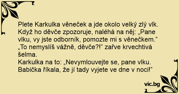 Karkulka na to: „Nevymlouvejte se, pane vlku. Babička říkala, že jí tady vyjete ve dne v noci!”