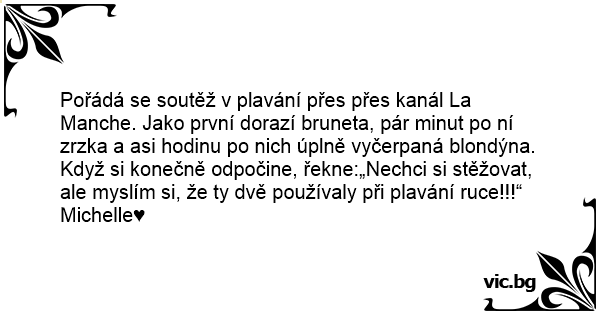 Pořádá se soutěž v plavání přes přes kanál La Manche. Jako první dorazí bruneta, pár minut po ní zrzka a asi hodinu po nich úplně vyčerpaná blondýna.