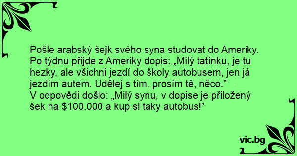 Pošle arabský šejk svého syna studovat do Ameriky. Po týdnu přijde z Ameriky dopis: „Milý tatínku, je tu hezky, ale všichni jezdí do školy autobusem, jen já jezdím autem. Udělej s tím, prosím tě, něco.”