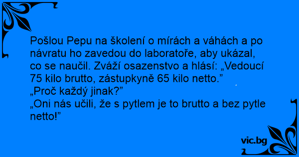Pošlou Pepu na školení o mírách a váhách a po návratu hо zavedou do laboratoře, aby ukázal, co se naučil. Zváží osazenstvo a hlásí: „Vedoucí 75 kilo brutto, zástupkyně 65 kilo netto.”