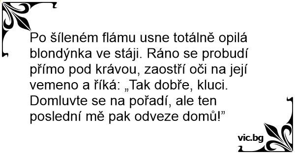 Po šíleném flámu usne totálně opilá blondýnka ve stáji. Ráno se probudí přímo pod krávou, zaostří oči na její vemeno a říká: „Tak dobře, kluci. Domluvte se na pořadí, ale ten poslední mě pak odveze domů!”