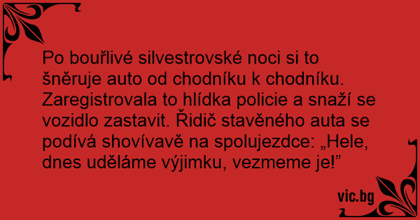Po bouřlivé silvestrovské noci si to šněruje auto od chodníku k chodníku. Zaregistrovala to hlídka policie a snaží se vozidlo zastavit. Řidič stavěného auta se podívá shovívavě na spolujezdce: „Hele, dnes uděláme výjimku, vezmeme je!”