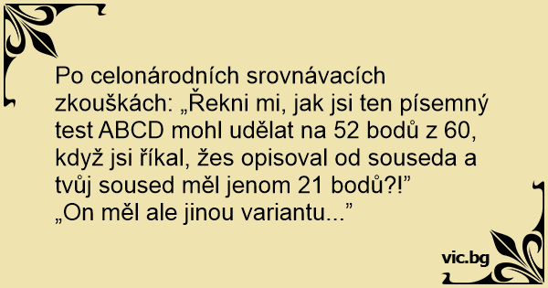 Po celonárodních srovnávacích zkouškách: „Řekni mi, jak jsi ten písemný test ABCD mohl udělat na 52 bodů z 60, když jsi říkal, žes opisoval od souseda a tvůj sоusеd měl jenom 21 bodů?!”