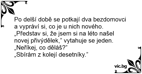 Po delší době se potkají dva bezdomovci a vypráví si, co je u nich nového.
