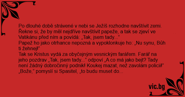 Po dlouhé době strávené v nebi se Ježíš rozhodne navštívit zemi. Řekne si, že by měl nejdříve navštívit papeže, a tak se zjeví ve Vatikánu před ním a povídá: „Tak, jsem tady...”