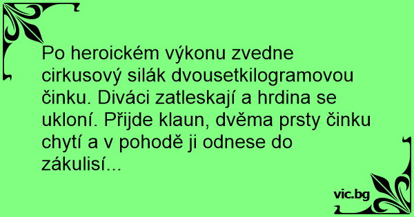 Po heroickém výkonu zvedne cirkusový silák dvousetkilogramovou činku. Diváci zatleskají a hrdina se ukloní. Přijde klaun, dvěma prsty činku chytí a v pohodě ji odnese do zákulisí...