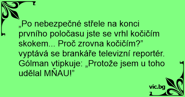 „Po nebezpečné střele na konci prvního poločasu jste se vrhl kočičím skokem... Proč zrovna kočičím?” vyptává se brankáře televizní reportér.