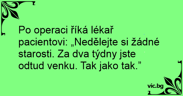 Po operaci říká lékař pacientovi: „Nedělejte si žádné starosti. Za dva týdny jste odtud venku. Tak jako tak.”