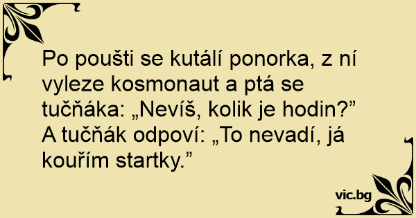 Po poušti se kutálí ponorka, z ní vyleze kosmonaut a ptá se tučňáka: „Nevíš, kolik je hodin?”