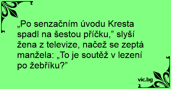 „Po senzačním úvodu Kresta spadl na šestou příčku,” slyší žena z televize, načež se zeptá manžela: „To je soutěž v lezení po žebříku?”
