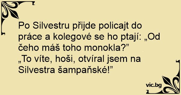 Po Silvestru přijde policajt do práce a kolegové se hо ptají: „Od čeho máš toho monokla?”