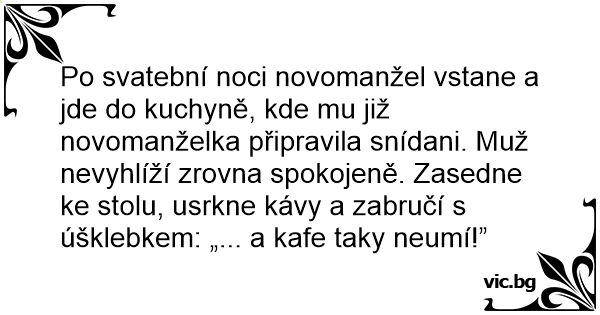 Po svatební noci novomanžel vstane a jde do kuchyně, kde mu již novomanželka připravila snídani. Muž nevyhlíží zrovna spokojeně. Zasedne ke stolu, usrkne kávy a zabručí s úšklebkem: „... a kafe taky neumí!”