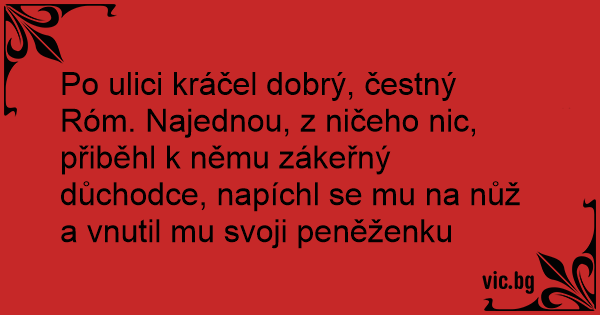 Po ulici kráčel dobrý, čestný Róm. Najednou, z ničeho nic, přiběhl k němu zákeřný důchodce, napíchl se mu na nůž a vnutil mu svoji peněženku
