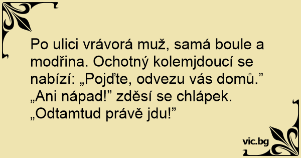 Po ulici vrávorá muž, samá boule a modřina. Ochotný kolemjdoucí se nabízí: „Pojďte, odvezu vás domů.”