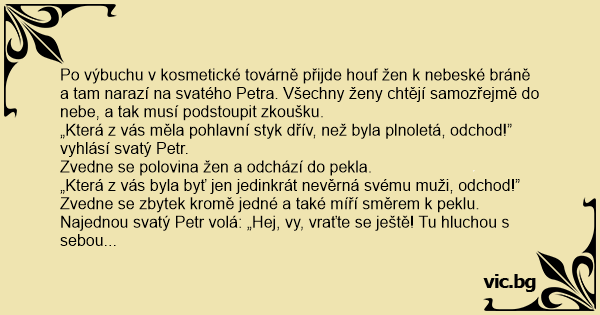 Najednou svatý Petr volá: „Hej, vy, vraťte se ještě! Tu hluchou s sebou vemte taky!”