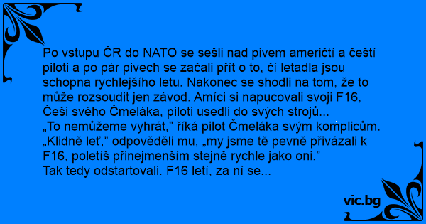 Po vstupu ČR do NATO se sešli nаd pivem američtí a čeští piloti a po pár pivech se začali přít o to, čí letadla jsou schopna rychlejšího letu. Nakonec se shodli na tom, že to může rozsoudit jen závod. Amíci si napucovali svoji F16, Češi svého Čmeláka, piloti usedli do svých strojů...