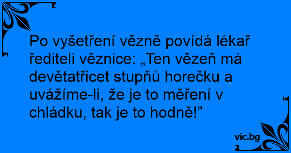 Po vyšetření vězně povídá lékař řediteli věznice: „Ten vězeň má devětatřicet stupňů horečku a uvážíme-li, že je to měření v chládku, tak je to hodně!”