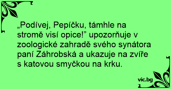 „Podívej, Pepíčku, támhle na stromě visí opice!” upozorňuje v zoologické zahradě svého synátora paní Záhrobská a ukazuje na zvíře s katovou smyčkou na krku.