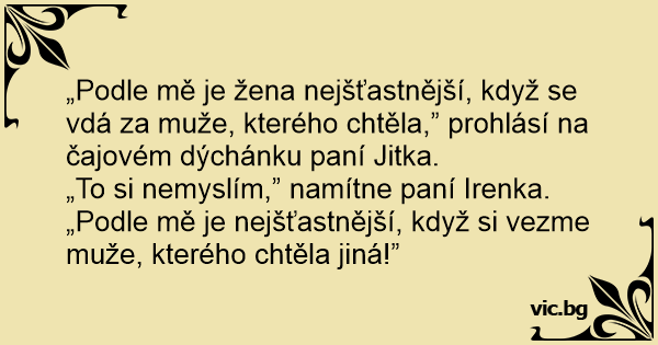 „To si nemyslím,” namítne paní Irenka. „Podle mě je nejšťastnější, když si vezme muže, kterého chtěla jiná!”