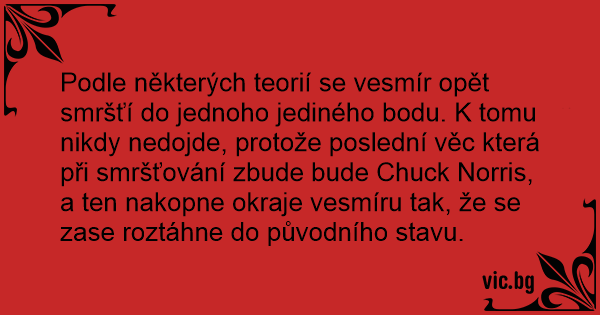 Podle některých teorií se vesmír opět smršťí do jednoho jediného bodu. K tomu nikdy nedojde, protože poslední věc která při smršťování zbude bude Chuck Norris, a ten nakopne okraje vesmíru tak, že se zase roztáhne do původního stavu.