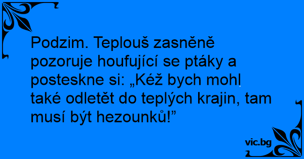 Podzim. Teplouš zasněně pozoruje houfující se ptáky a posteskne si: „Kéž bych mohl také odletět do teplých krajin, tam musí být hezounků!”
