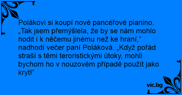 „Tak jsem přemýšlela, že by se nám mohlo hodit i k něčemu jinému než ke hraní,” nadhodí večer paní Poláková. „Když pořád straší s těmi teroristickými útoky, mohli bychom hо v nouzovém případě použít jako kryt!”