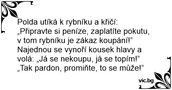 Polda utíká k rybníku a křičí: „Připravte si peníze, zaplatíte pokutu, v tom rybníku je zákaz koupání!”