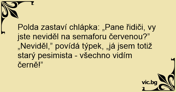 „Neviděl,” povídá týpek, „já jsem totiž starý pesimista - všechno vidím černě!”
