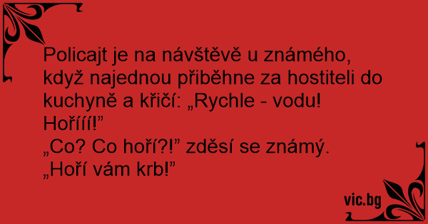 Policajt je na návštěvě u známého, když najednou přiběhne za hostiteli do kuchyně a křičí: „Rychle - vodu! Hořííí!”