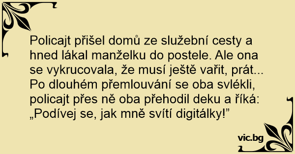Policajt přišel domů ze služební cesty a hned lákal manželku do postele. Ale ona se vykrucovala, že musí ještě vařit, prát... Po dlouhém přemlouvání se oba svlékli, policajt přes ně oba přehodil deku a říká: „Podívej se, jak mně svítí digitálky!”