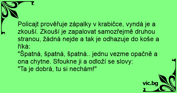 Policajt prověřuje zápalky v krabičce, vyndá je a zkouší. Zkouší je zapalovat samozřejmě druhou stranou, žádná nejde a tak je odhazuje do koše a říká:
